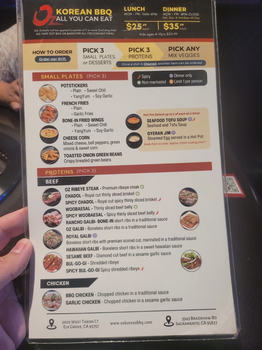 “ We have been going to Oz Korean BBQ for years! Of all of the KBBQ places we have gone to in Elk Grove and Sacramento, this is the one that we keep coming back to and use it as our standard of quality. Oz has great meat quality and selection, excellent side dishes, good service, is clean and fairly priced. Because it is such a busy place, my husband and I prefer to go on off-peak times like 2pm on weekdays. Upon arriving, you usually have to wait about ten minutes before being escorted to your table. Once there, you are greeted by a server who brings your side dishes, turns on your grill, and takes your drink and first order. You get to choose 3 starters, three meats, side dishes and sauces. We like the chili pork, chadol, and many of the other pork and beef options. The chicken and seafood options just aren’t our speed. The meat arrives via a cute cat shaped robot waiter. You take the dishes off your tray and get cooking! It doesn’t take long to cook the pork and beef options… Lately we have noticed that the ventilation system is having a hard time keeping up, meaning your table can get smoky and your clothes will smell after your meal. Every time our grill appeared black, someone was there to swap it out. Our server, Eli, was very knowledgeable about the menu and its dishes, and he kept our drinks full and offered us subsequent meat and side dishes often. The restaurant and bathrooms are clean. The meal itself is a fun and delicious experience. There is a bar— but I’ve never seen anyone sitting there. On the tvs they play KPop music videos and slideshows of all of the restaurant offerings. Plus, they have a big wheel that you can spin if it is your birthday! Overall, Oz Korean BBQ is a wonderful place for a day date or just a meal in general. Just don’t try and go at peak times… or expect a long wait! ”